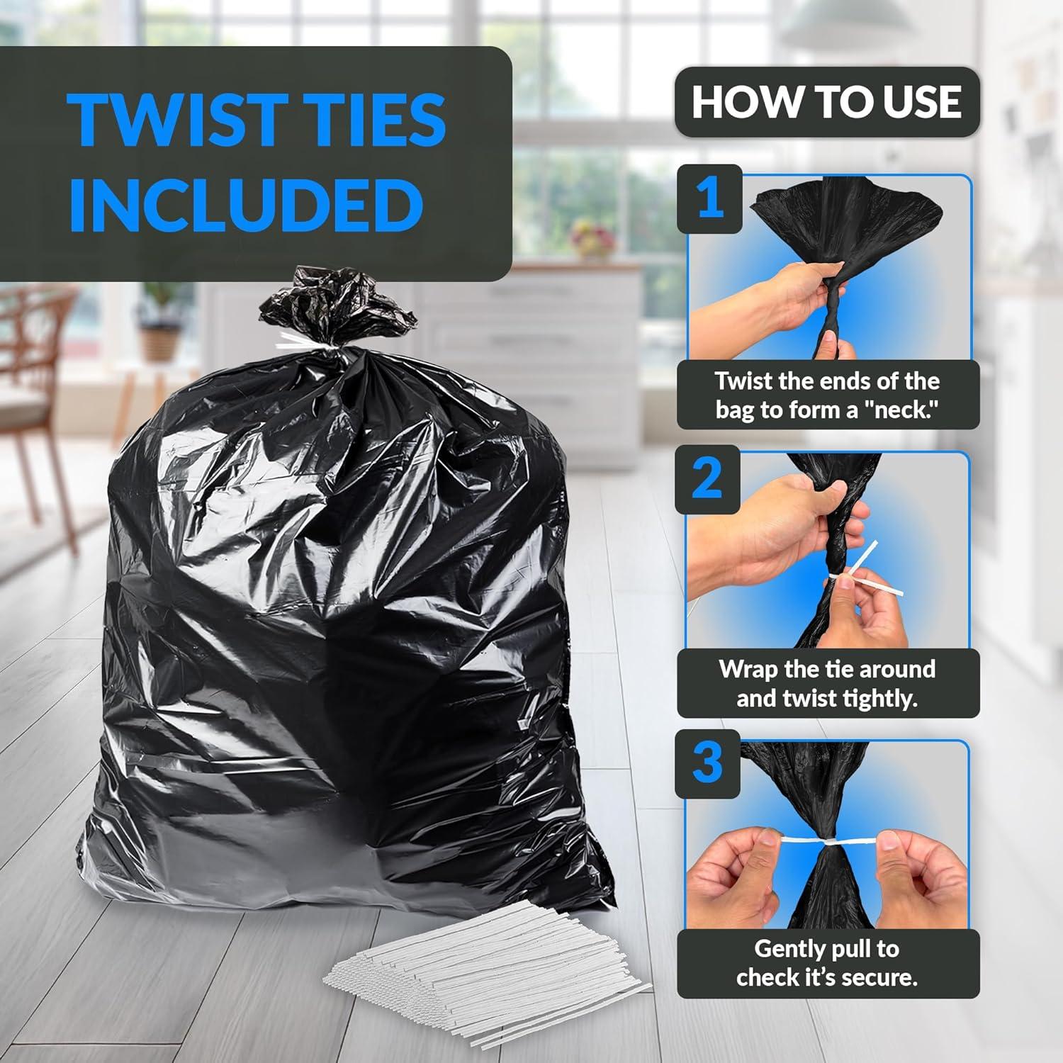Super Value: 100 large trash bags (55-60 Gallon) with twist ties included. Heavy duty performance for demanding residential, commercial, and industrial applications.
