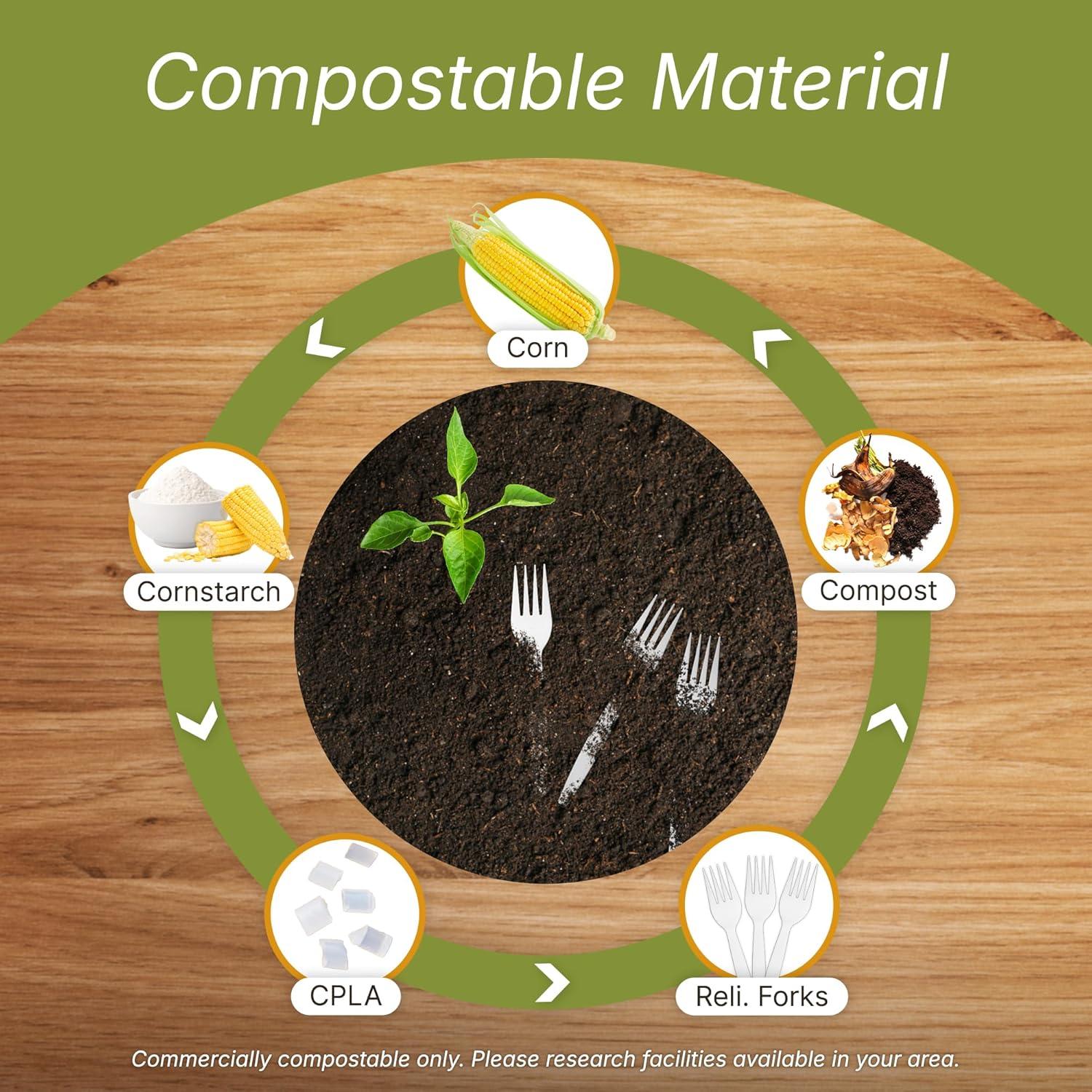 Compostable: High quality, 100% compostable CPLA material breaks down naturally in commercial composting facilities, making these disposable utensils an eco-friendly choice!