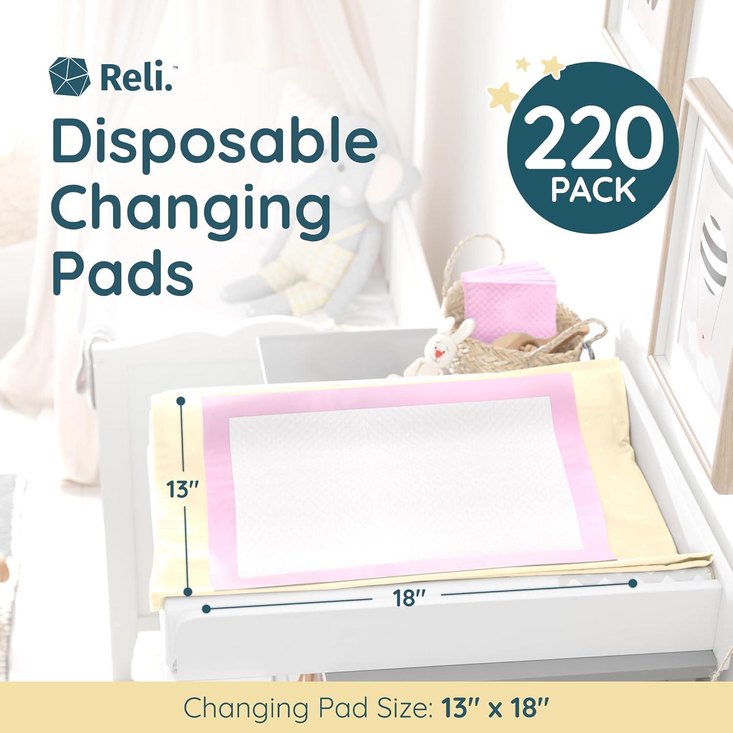 Reli. Disposable Changing Pads for Baby (220 Pack) | Disposable Diaper Changing Pads, 13″ x 18″ | Super Absorbent, Leak-Proof Liners | Waterproof, Quick Dry Underpads (Pink/White)